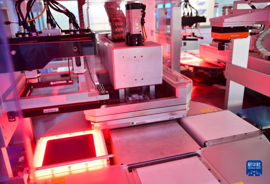 這是在隆基單晶硅太陽能電池工廠內進行絲網印刷工序的電池片(3月25日攝)。
