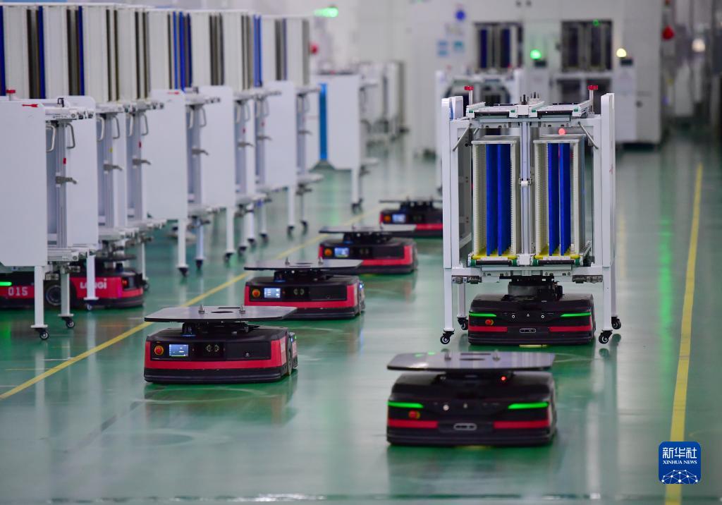 3月25日,智能搬運機器人在隆基單晶硅太陽能電池工廠內(nèi)工作。