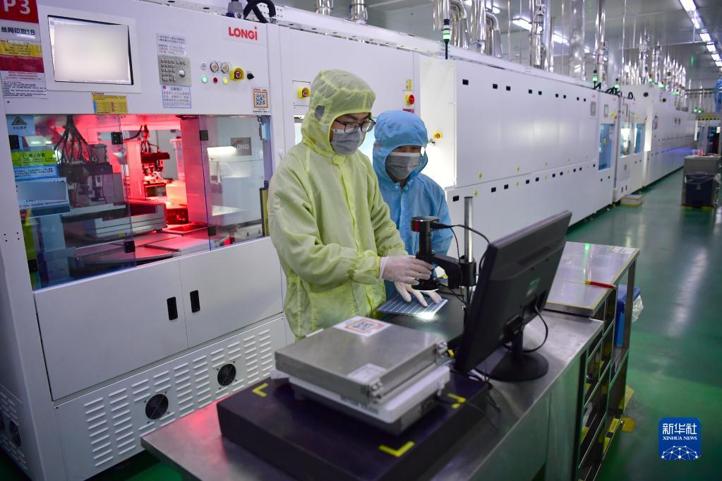3月25日,工作人員在隆基單晶硅太陽能電池工廠內檢查電池片。