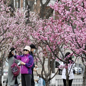 近期,北京市明城墻遺址公園內桃花盛開,吸引大批市民前來賞花踏青。