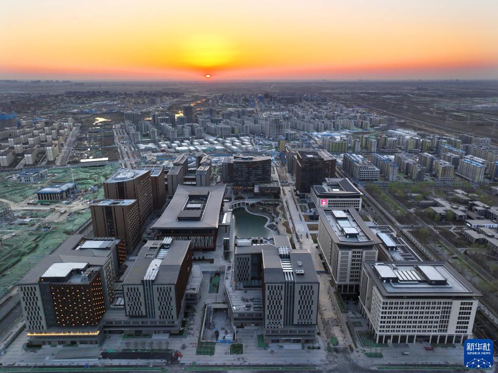 4月1日在雄安新區(qū)拍攝的日出(無(wú)人機(jī)照片)。