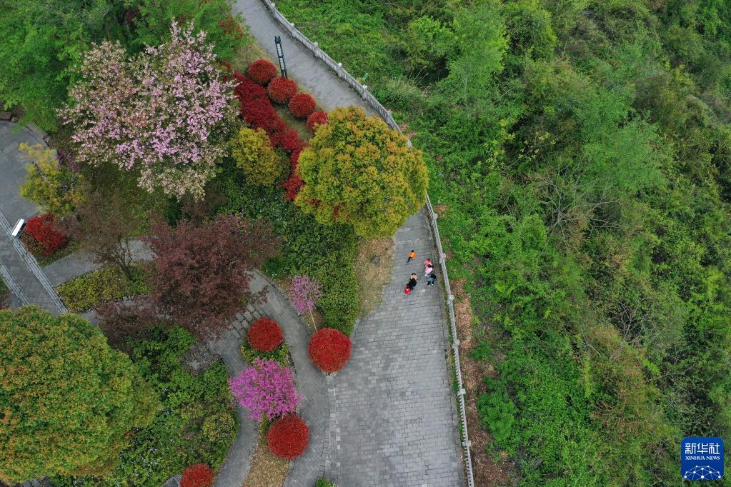 4月4日,在重慶市酉陽土家族苗族自治縣一“口袋公園”,居民在踏青賞景(無人機照片)。