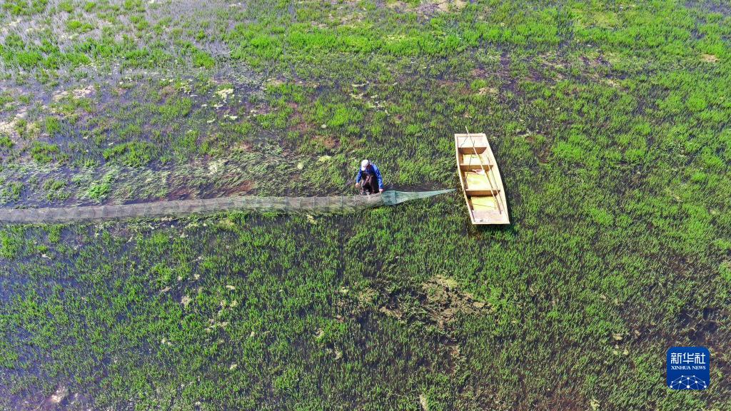 4月6日 ,在湖南省衡陽市常寧市板橋鎮新橋村,農民在稻蝦共養稻田里整理小龍蝦蝦籠(無人機照片)。
