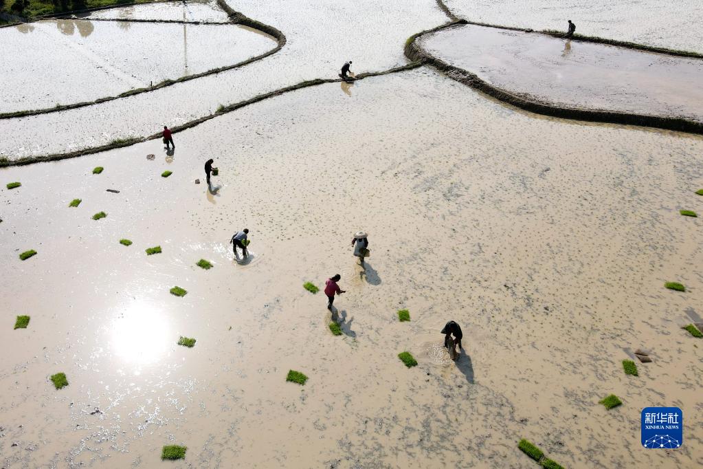 4月6日,在湖南省婁底市雙峰縣井字鎮花山村,農民在田間拋秧(無人機照片)。