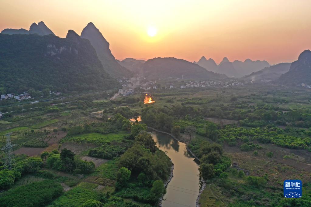 春意日濃,廣西桂林市陽朔縣遇龍河沿岸山清水碧,田園斑斕,宛如一幅幅山水田園畫卷。