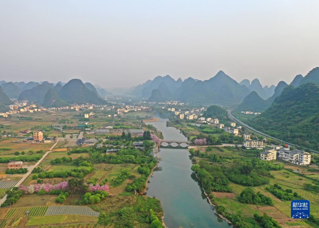 春意日濃,廣西桂林市陽朔縣遇龍河沿岸山清水碧,田園斑斕,宛如一幅幅山水田園畫卷。