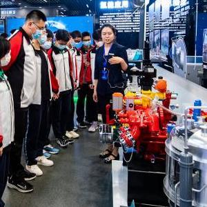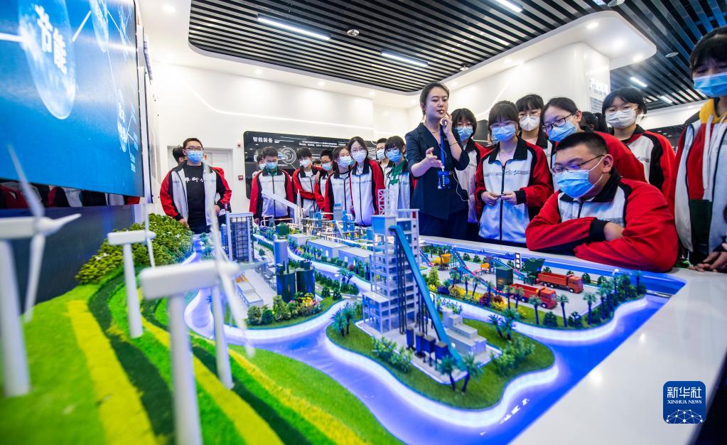 4月24日,在航天科技集團六院航天液體動力展示中心,講解員宋柱英(中)為前來參觀的西安市航天中學學生講解。