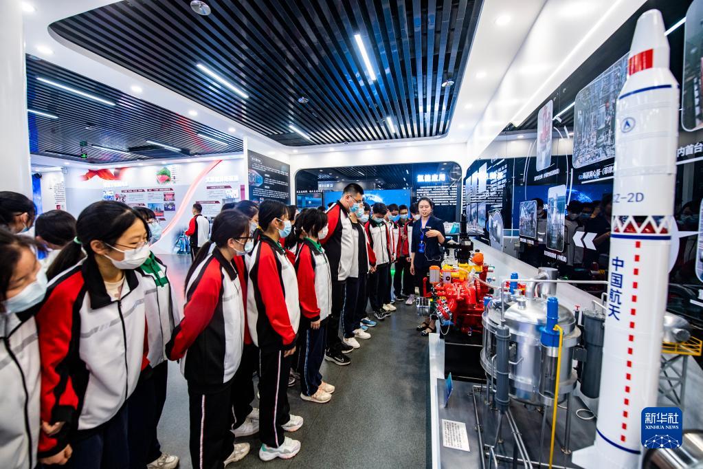4月24日,在航天科技集團六院航天液體動力展示中心,講解員宋柱英(中)為前來參觀的西安市航天中學學生講解。