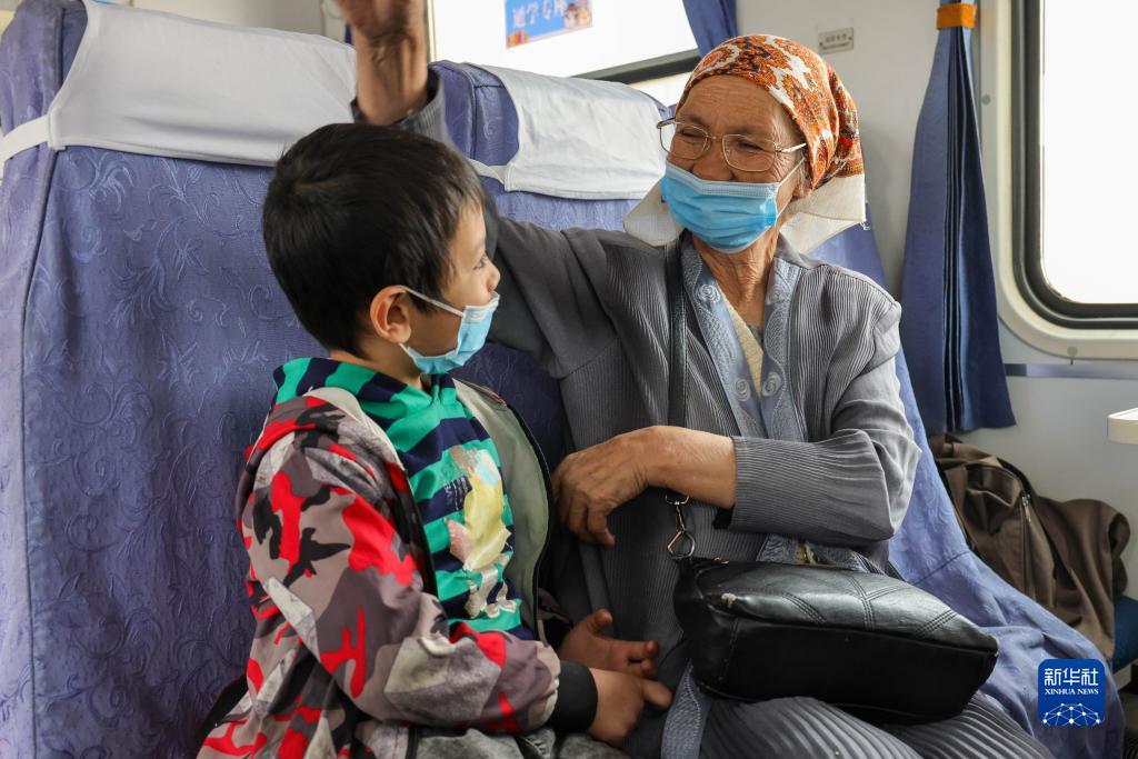在開往和田方向的“和田玉龍?zhí)枴绷熊嚿希先撕秃⒆恿奶欤?月27日攝)。