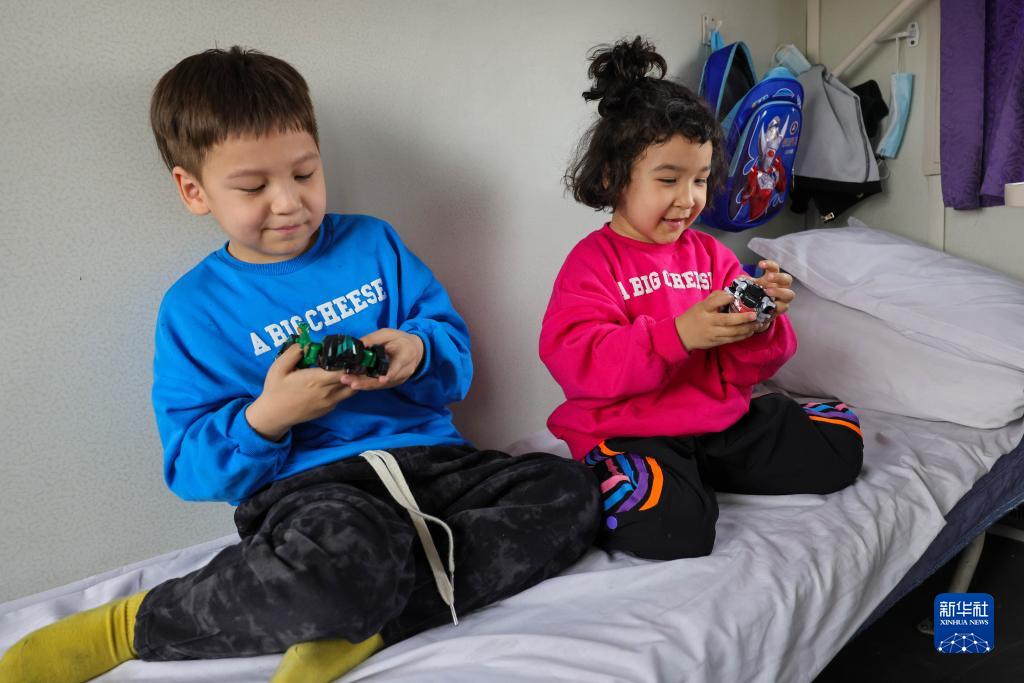 在開往和田方向的“和田玉龍?zhí)枴绷熊嚿希瑑擅∨笥言谲噹才P上玩耍(4月27日攝)。