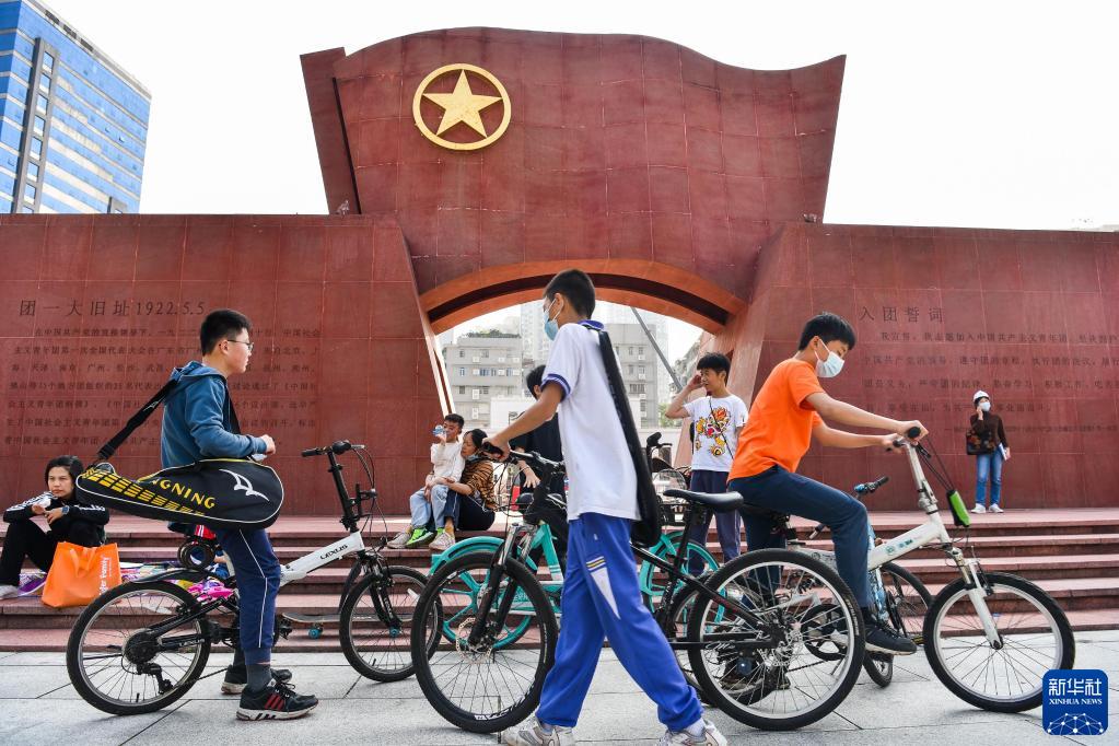 5月3日,一群青年學生在廣州團一大廣場上。