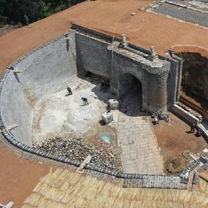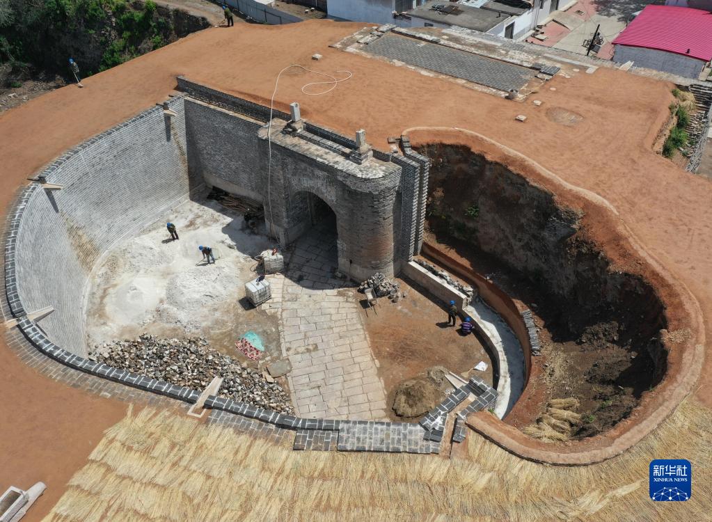 5月7日,工人在秦皇島市盧龍縣城的明代永平府城墻西門(mén)甕城修繕工程現(xiàn)場(chǎng)施工(無(wú)人機(jī)照片)。