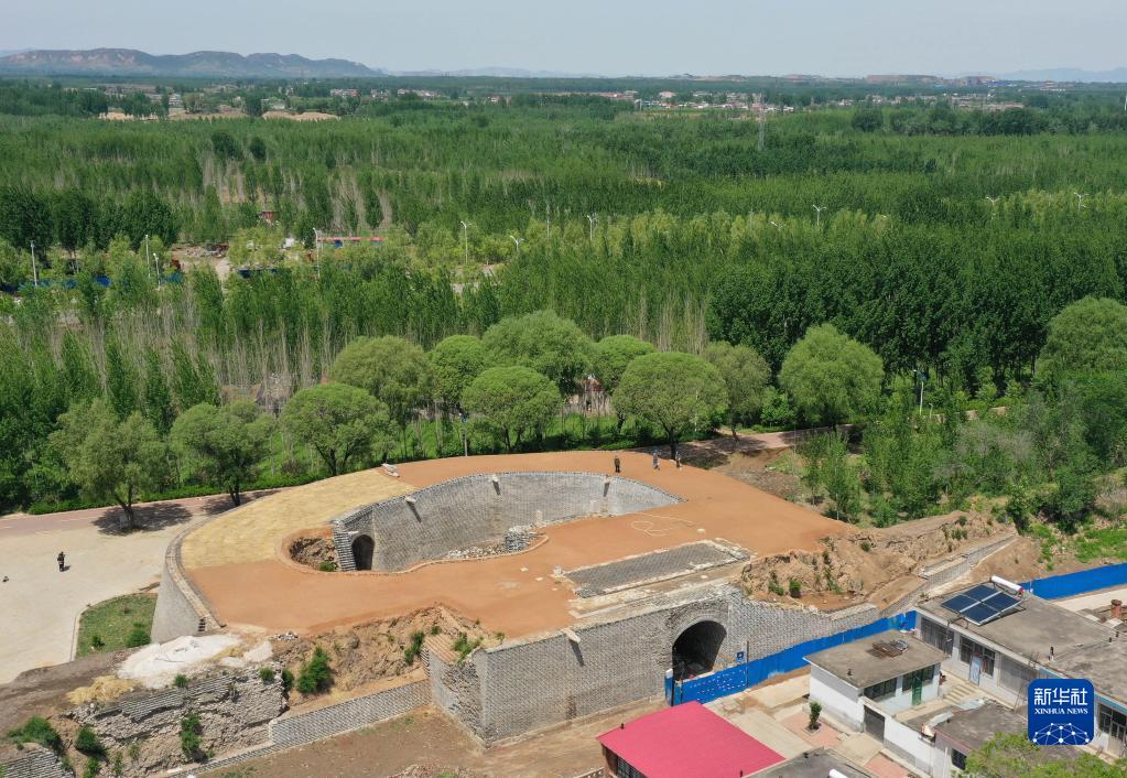 5月7日,工人在秦皇島市盧龍縣城的明代永平府城墻西門甕城修繕工程現(xiàn)場施工(無人機照片)。