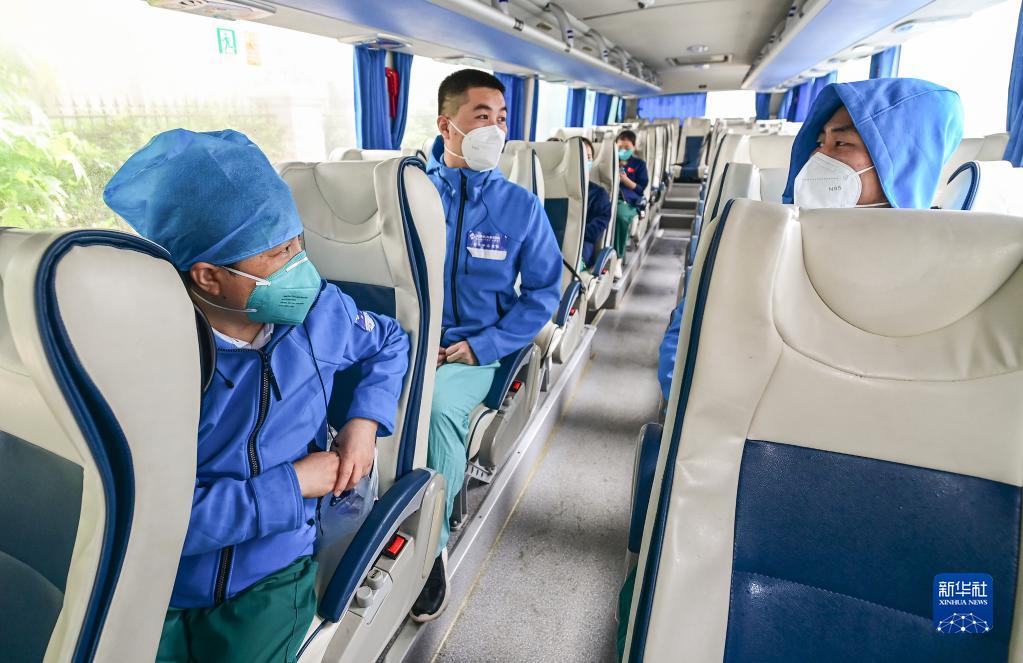 胡鷹鷹(左)在由同濟大學(xué)附屬上海第四人民醫(yī)院返回住地的大巴車上向剛下夜班的隊員問詢院感防控情況(5月13日攝)。