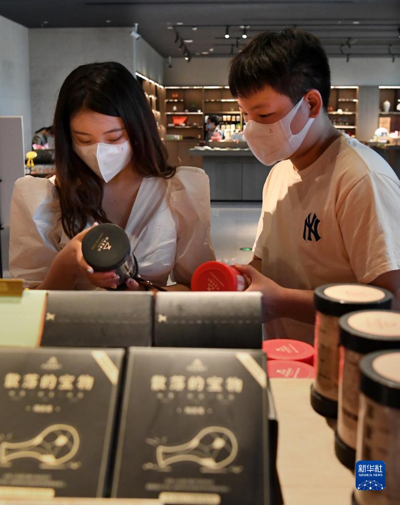 5月17日,兩位參觀者在河南博物院文創(chuàng)商店內(nèi)挑選考古盲盒。