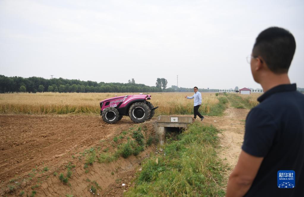 5月25日,在位于河南省鄧州市的首邑農業(鄧州)無人農場創新應用基地,沈興新(左)和公司員工交流無人拖拉機的運行狀態。