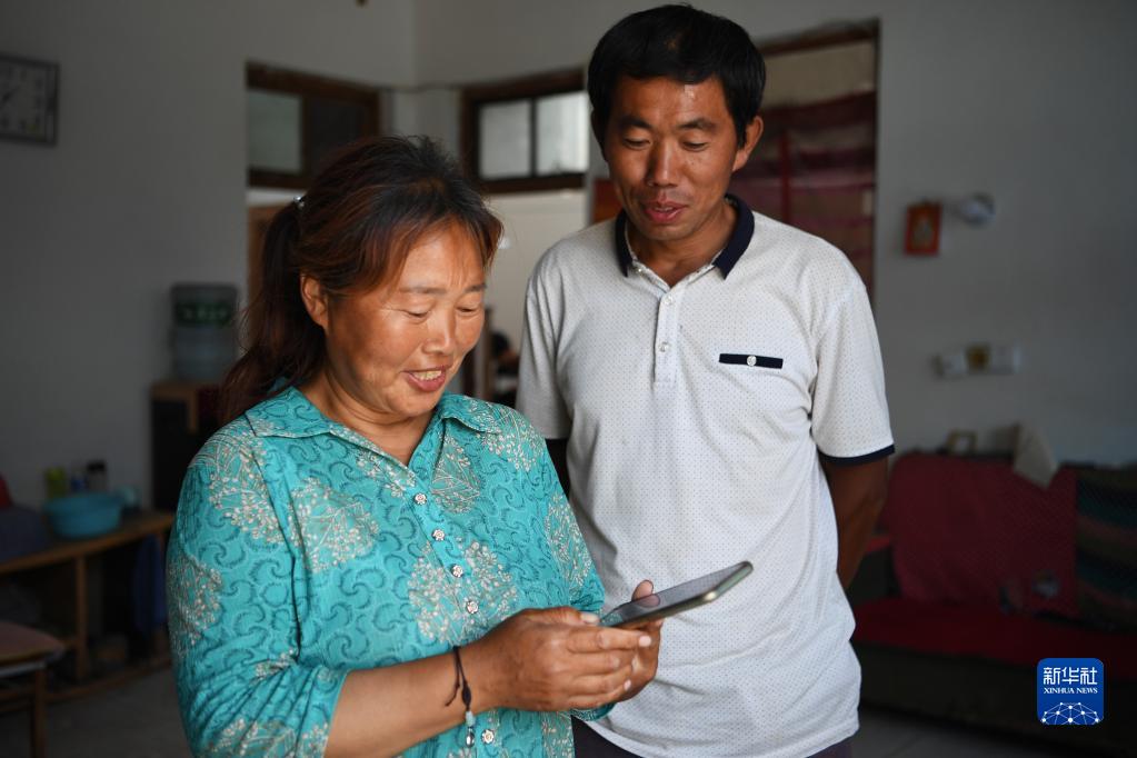 6月7日,在衛(wèi)輝市劉板橋村,看著手機(jī)上收糧點(diǎn)打來的賣糧款,劉建儒(右)和牛玉蘋很高興。