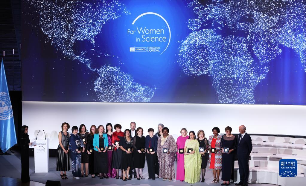 6月23日,在位于法國巴黎的聯合國教科文總部,榮獲2020、2021、2022年度“世界杰出女科學家獎”的15位獲獎者與聯合國教科文組織總干事奧德蕾·阿祖萊等在頒獎典禮后合影留念。