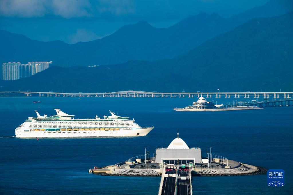 一艘巨輪通過港珠澳大橋東、西人工島之間的伶仃洋主航道(2018年7月27日攝)。港珠澳大橋橫跨珠江口伶仃洋海域,全長約55公里,集橋、島、隧于一體,是世界最長的跨海大橋。