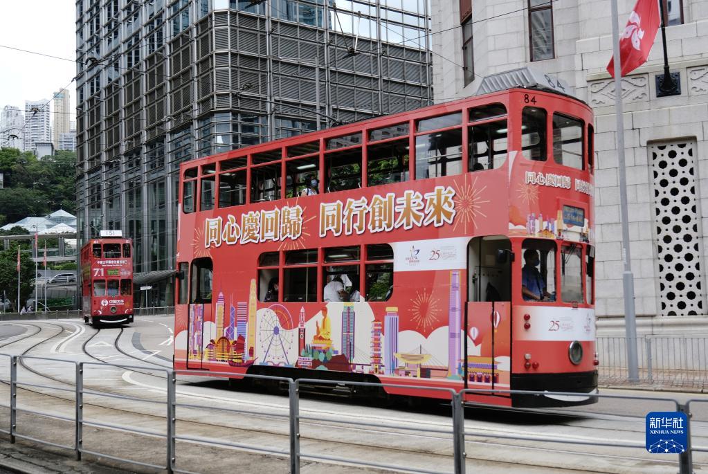 6月30日,涂裝慶祝香港回歸祖國25周年海報的電車在香港中環行駛。