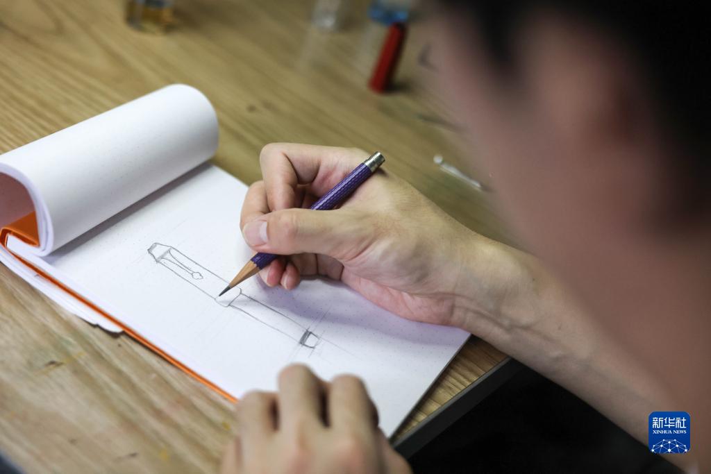 7月1日,袁建在位于貴州大學國家大學科技園的工作室繪制設計草圖。