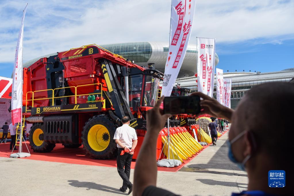 7月3日,在2022新疆農業機械博覽會上,與會者拍攝棉花收獲機。