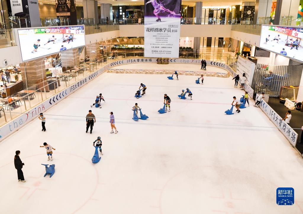 6月26日晚,游客在重慶江北嘴一商場內的滑冰場體驗。
