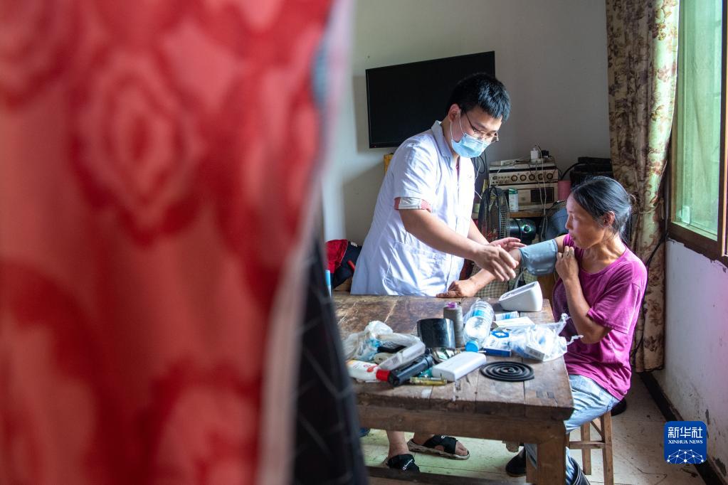 7月1日,村醫(yī)胡嘯(左)在一名村民家中為她做診療。