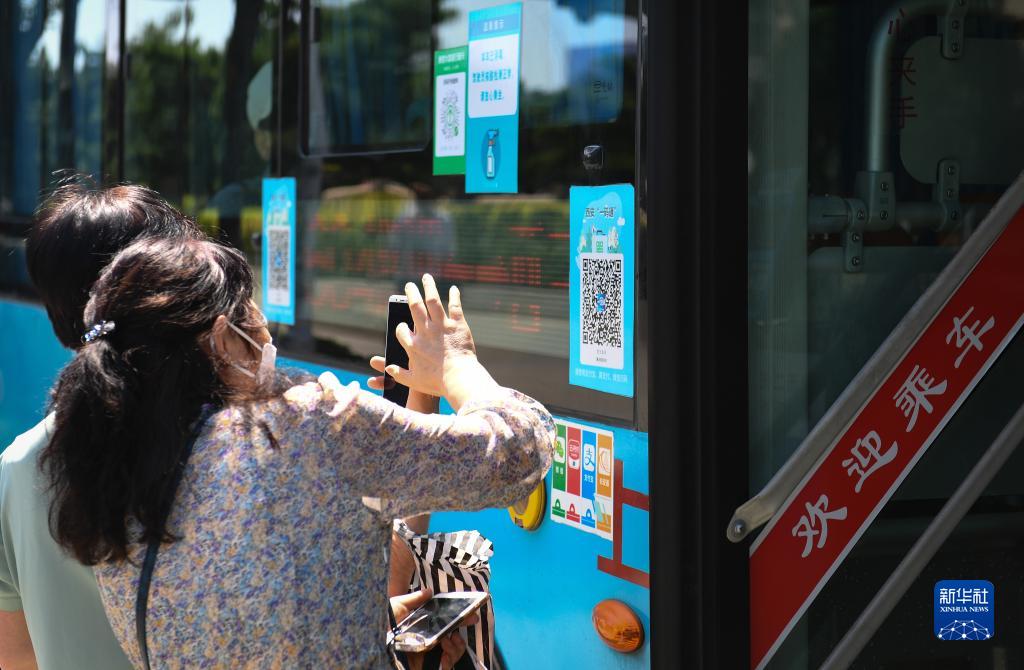 7月6日,乘客在西安市鐘樓附近一公交站掃碼乘車。