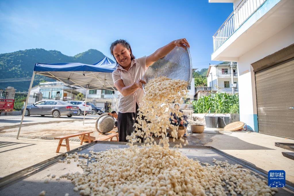 7月14日,在重慶市巫溪縣蘭英鄉(xiāng)西安村,村民將貝母倒入烘干托盤。
