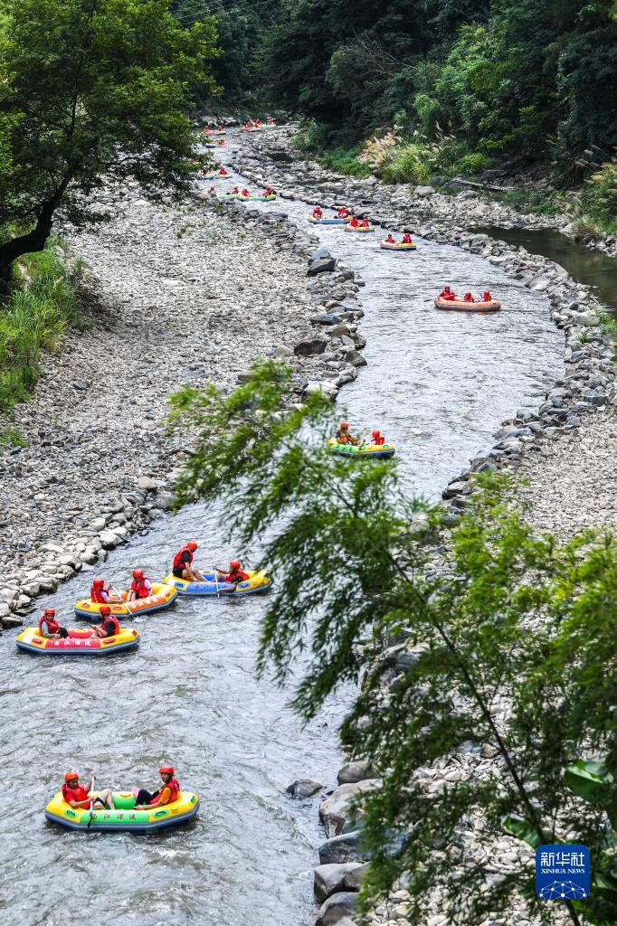 7月17日,在位于湖南省常寧市的天堂山國家森林公園,孩子們在家長的陪伴下體驗水上漂流。