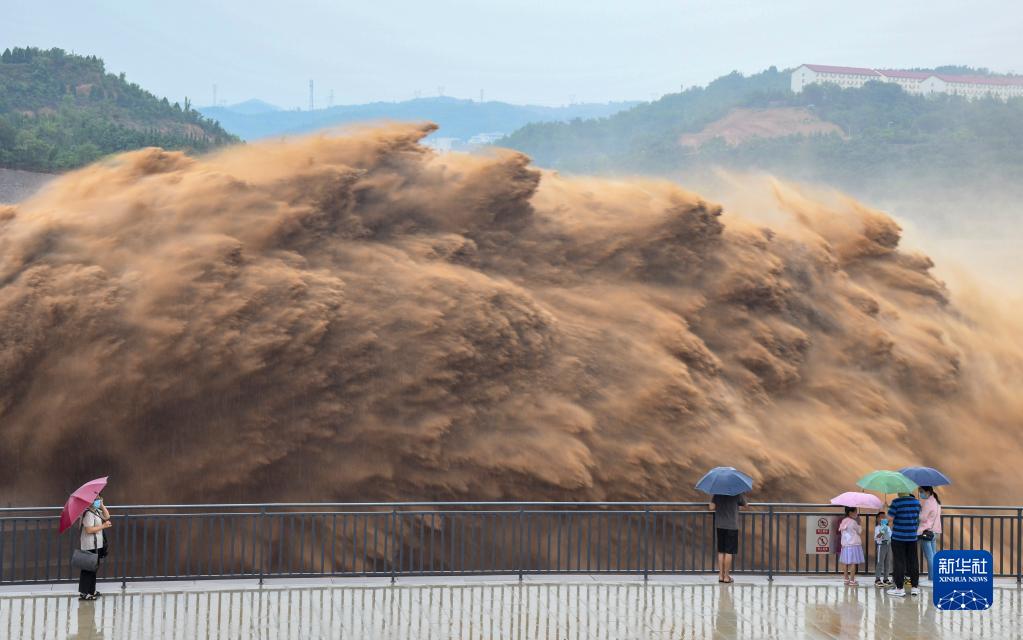 7月19日,游客觀看黃河小浪底水庫大流量泄洪。