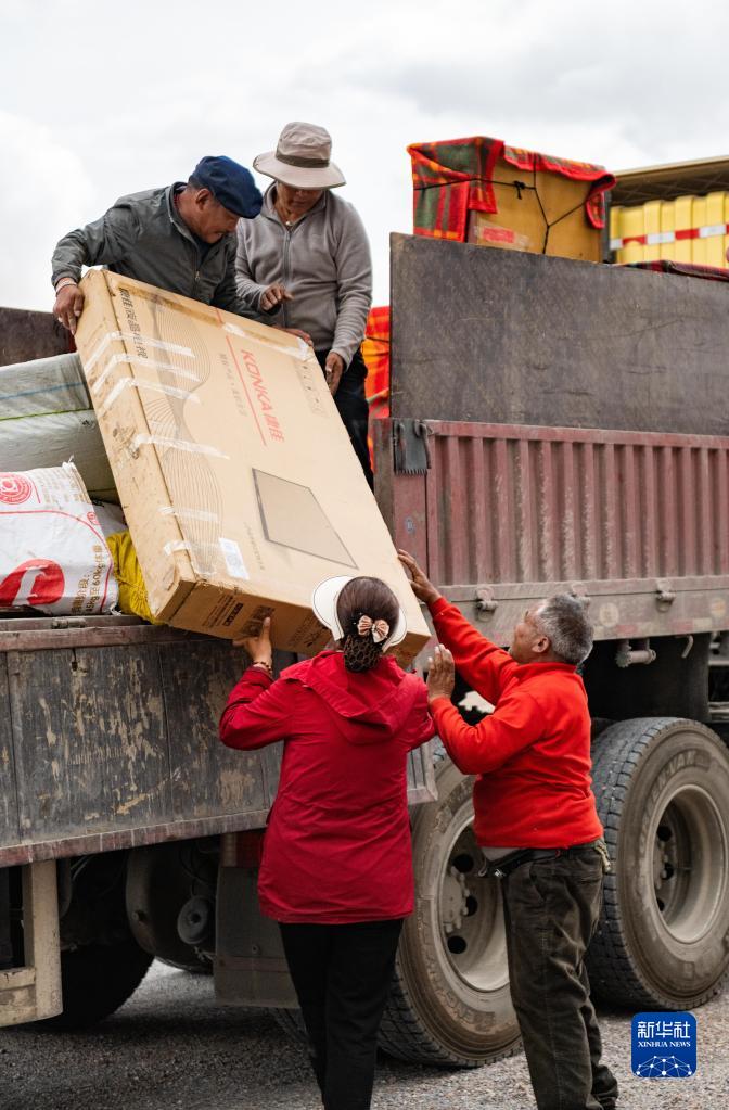 雙湖縣多瑪鄉果根擦曲村的村民將行李搬上貨車(7月12日攝)。