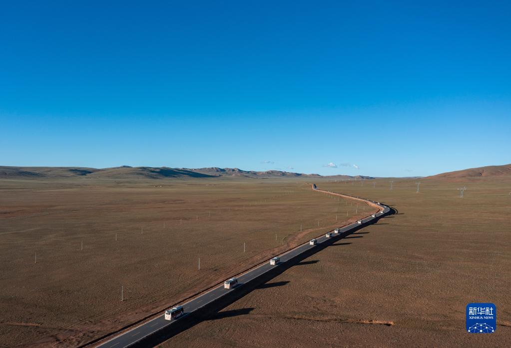 從雙湖縣出發(fā)的車隊行駛在前往森布日安置點的道路上(7月19日攝,無人機照片)。