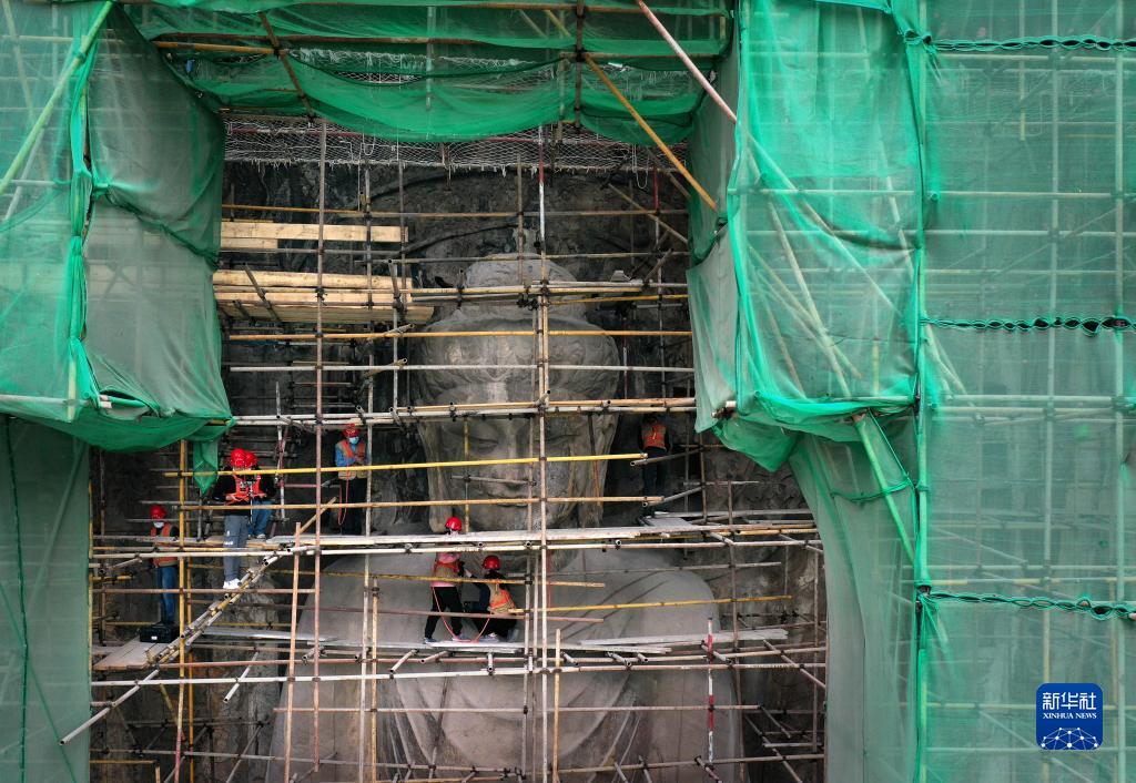 工作人員在洛陽龍門石窟奉先寺進(jìn)行病害調(diào)查評估(4月14日攝,無人機(jī)照片)。 新華社記者 李安 攝