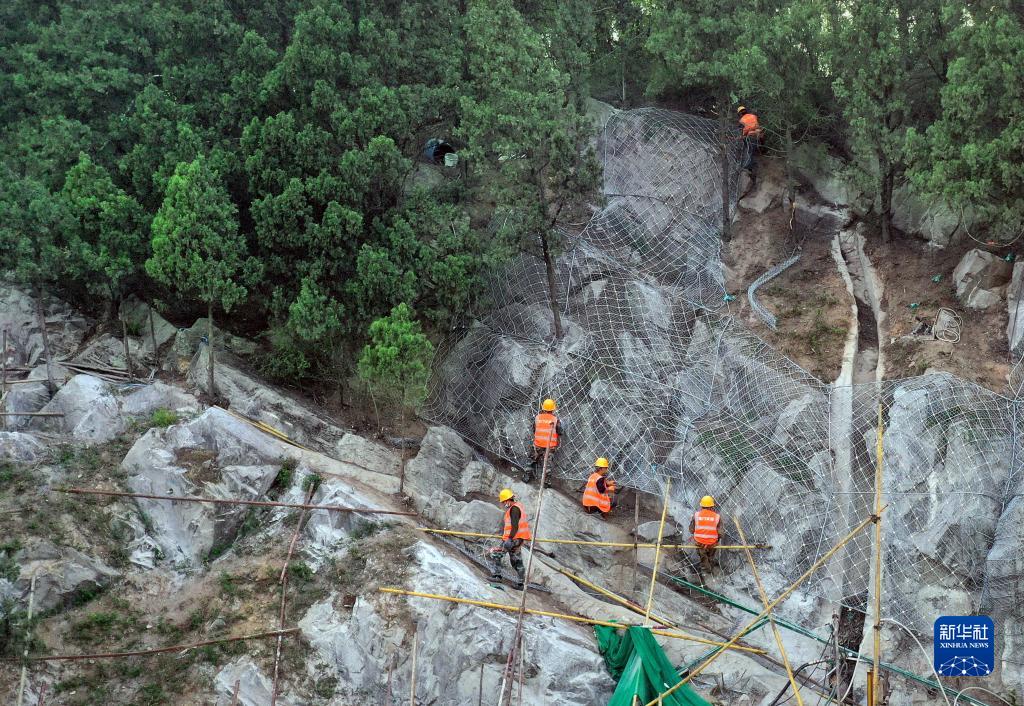 工作人員在洛陽龍門石窟奉先寺安裝防護網(wǎng)(4月13日攝,無人機照片)。 新華社記者 李安 攝
