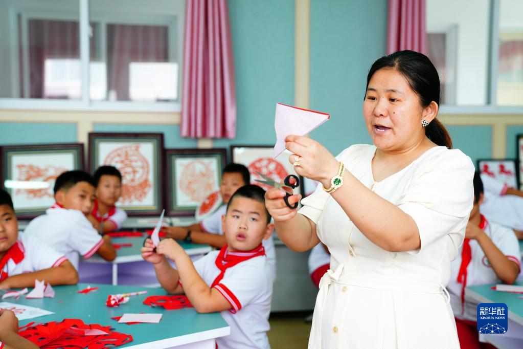 7月28日,在山東省齊河縣祝阿鎮馬坊社區鄉村“復興少年宮”,孫春華在教小朋友剪紙。