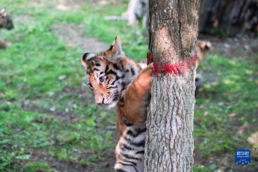 7月29日,東北虎幼虎在中國橫道河子貓科動物飼養繁育中心活動區玩耍。