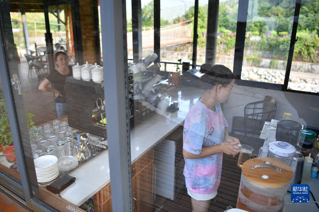 7月30日,留壩縣火燒店鎮一家飲品店的工作人員在為顧客制作飲品。
