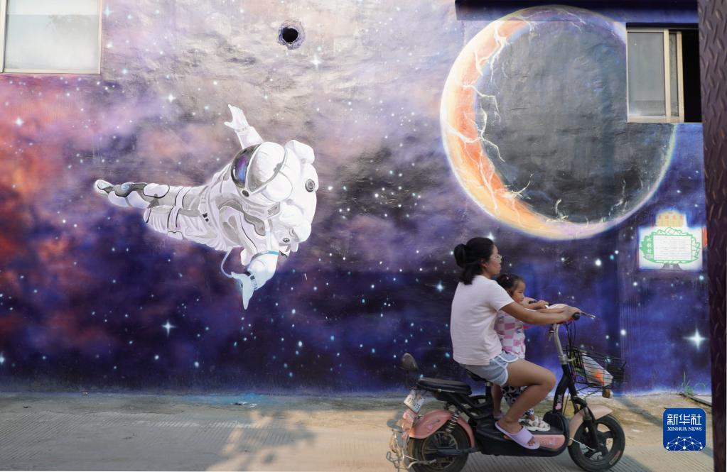 8月3日,北張村村民從墻繪藝術畫前經過。