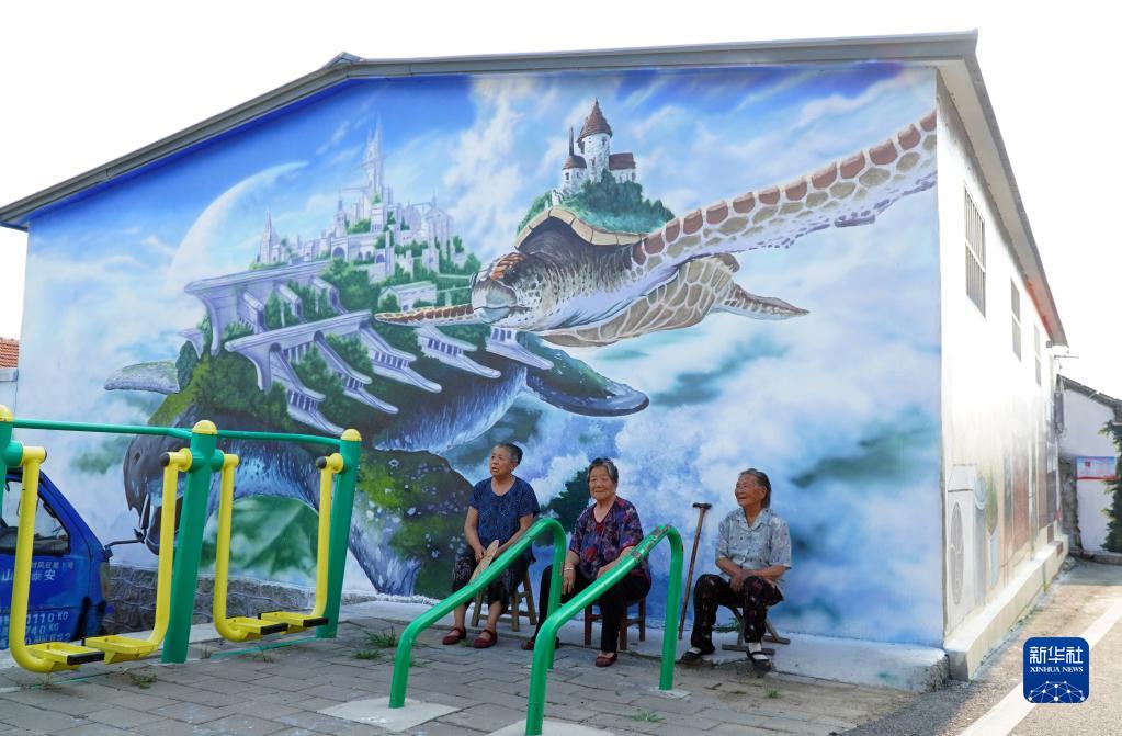 8月3日,北張村村民在墻繪藝術畫前休憩。