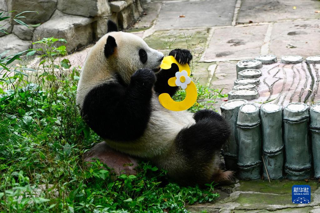 8月3日,在中國大熊貓保護研究中心雅安基地,大熊貓“雅雅”舉著數字“3”玩耍。