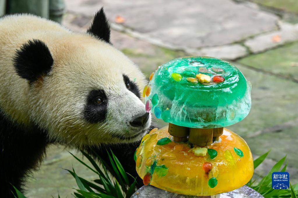 8月3日,在中國大熊貓保護研究中心雅安基地,大熊貓“安安”準備享用美食。