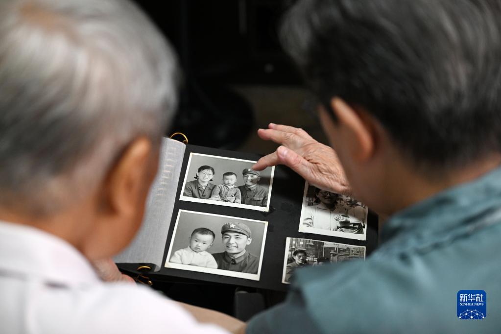 段肇誼(右)和顧偉力在家翻看老照片(8月1日攝)。
