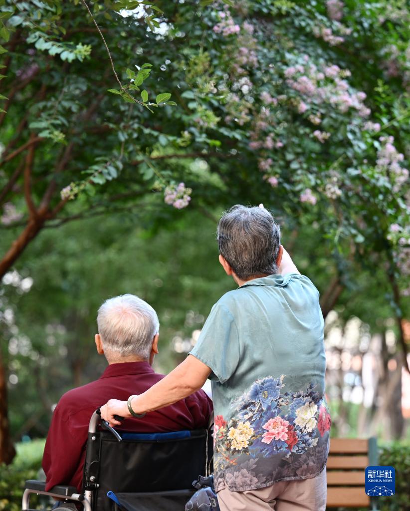 段肇誼(右)推著坐在輪椅上的顧偉力賞花(7月30日攝)。