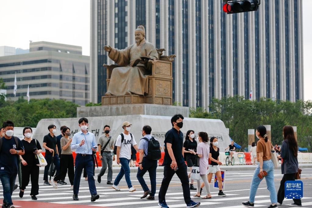8月3日,行人佩戴口罩在韓國首爾光化門廣場過馬路。