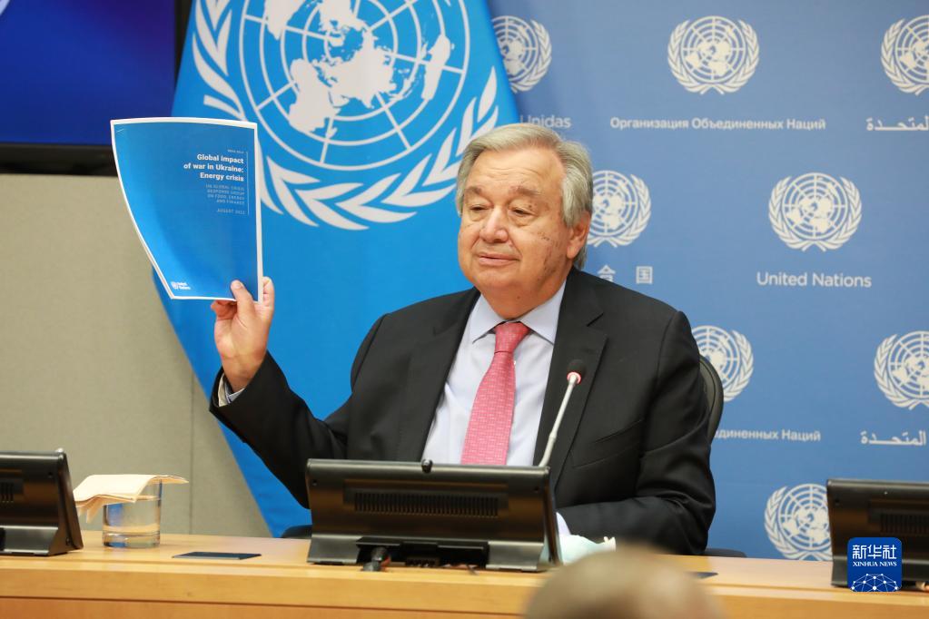 8月3日,在位于紐約的聯合國總部,聯合國秘書長古特雷斯出席聯合國全球糧食、能源和金融危機應對小組第三次報告發布會。