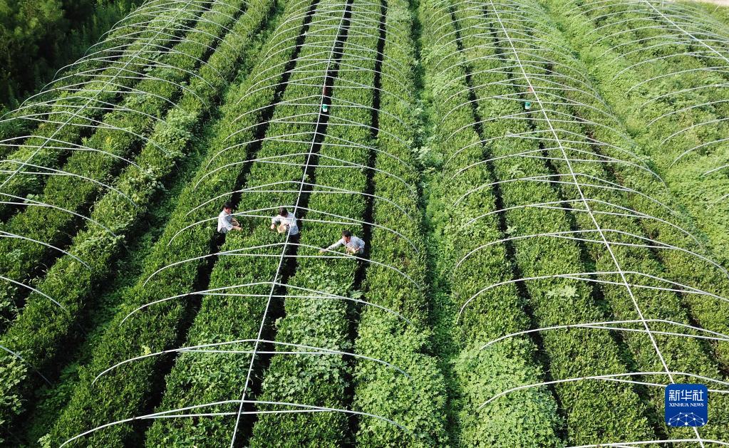 8月3日,在山東省泰安市岱岳區(qū)道朗鎮(zhèn),茶農(nóng)采摘夏茶(無人機照片)。