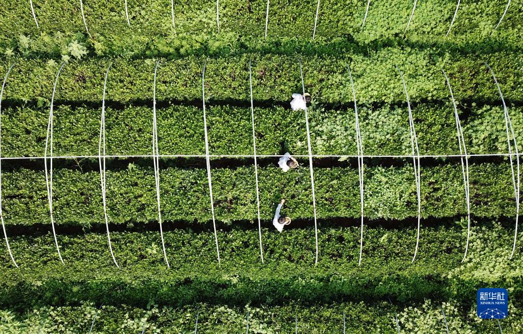 8月3日,在山東省泰安市岱岳區道朗鎮,茶農采摘夏茶(無人機照片)。
