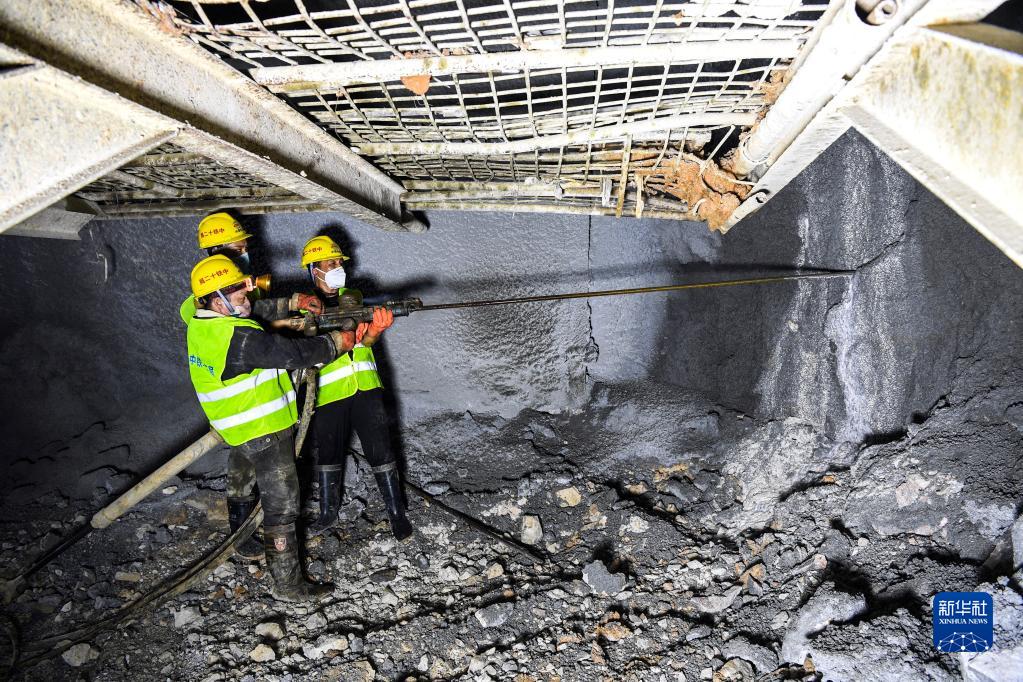 8月3日,在位于廣西環江毛南族自治縣的貴南高鐵大方山隧道內,工人用風槍打爆破眼。